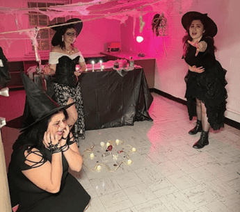 As you walk to the final room, you get attacked by the zombie in the bathroom, Camron Flowers, who is holding the head of his last victim and being restrained by caution tape. The very last room is the “Coven’’ room. As you look into the room, you can see an altar and a small circle set up on top with bones and crystals in the middle. Samantha Ricci is standing in the middle of the room with Michaela Kroll beside her as they chant, “By the time the deed is done, tomorrow morning we’ll be one.” At the end of the chant Samantha stabs herself but inflicts the wounds unto Michaela.