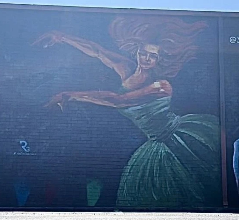 I was able to ask local Greensboro artist, Raman Bhardwaj, a few questions about his process. The mural was the first he has done on this scale and was originally a smaller painting based on dancers’ graceful movements. The entire mural took about three days to complete on a 20-foot-high wall. Raman used latex paint instead of acrylic to cut down on cost and implied a grid system along with a projector to get the outline down. He then used rollers, spray paint, paint guns and one by five-foot-wide flat brushes to color the mural. You can see his amazing work yourself at the Westover Gallery of Shop!